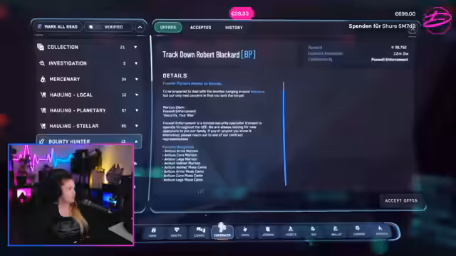 07:39:55Die Streamerin fliegt in die Nix-Region, um verschiedene Missionen abzuschließen. Sie konzentriert sich vor allem auf illegale Quests, da die legalen Aufgaben zu lange dauern würden. Während der Missionen kommt es zu Kampfhandlungen mit feindlichen Schiffen, und die Streamerin erfolgreich mehrere Ziele ausschaltet. Sie erwähnt, dass bestimmte Missionen wie die Savage-Station quest zu aufwendig sind und daher vermieden werden.