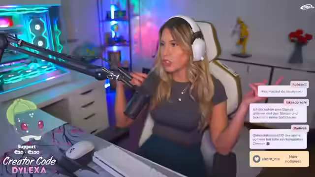 00:01:28Der Stream beginnt mit Begrüßungen an den Chat, wobei eine längere Abwesenheit einiger Nutzer erwähnt wird. Die Streamerin kündigt an, dass sie viel zu tun hat, darunter neue Wimpern, einen Solariumbesuch und einen Friseurtermin, da sie sich aktuell nicht frisch genug fühlt. Sie erwähnt zudem, dass sie einen neuen PC hat und sich auf ihre bevorstehende Abschlussprüfung vorbereiten muss. Das aktuelle Wetter wird als sehr stürmisch und gewittrig beschrieben, was bei der Streamerin für Unruhe sorgt.