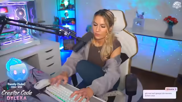 00:02:00Der Stream beginnt mit Dylexas Frust über ihre Haare, die heute einfach nicht sitzen wollen, trotz langem Styling-Aufwand. Sie begrüßt die Zuschauer, darunter Wavekid, Charly und Mila, und vergibt Punkte an die Community. Dylexa erklärt, dass ihre Haare wahrscheinlich gewaschen werden müssten, um besser gestylt zu werden, sie aber keine Lust dazu hatte, da das Föhnen eine halbe Stunde dauert. Sie erwähnt auch, dass sie gerade ein TikTok-Video zu einem neuen Cardigan aufgenommen hat, das sie bald posten wird. Sie hat ihren Schlafrhythmus bereits verbessert und streamt nun um 22 Uhr statt um Mitternacht. Zudem kündigt sie an, bald eine PS5 zu bekommen und wieder mehr zu zocken. Ein neues YouTube-Video über die Rubik's-Tastatur, mit der sie gestern gespielt hat, wurde ebenfalls hochgeladen und ihre Mods werden gebeten, einen Command dafür zu erstellen. Sie entschuldigt sich dafür, dass sie nicht früher streamen konnte, da sie müde war, eine Stunde lang gekocht und gegessen hat, was ihr starke Bauchschmerzen bereitete, und sich danach für den Stream fertiggemacht hat.