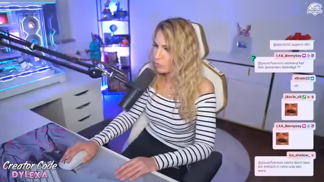 00:00:03Der Stream beginnt mit der Begrüßung der Zuschauer und der Erwähnung von Pseudonymen wie 'Jens' und 'Benni'. Die Streamerin bemängelt eine zu helle Beleuchtung, die sie reduziert, und stellt ihre Maus wieder her. Es folgt eine umfangreiche Auflistung der anwesenden Viewer im Chat. Im weiteren Verlauf des Anfangsabschnitts kommt es zu einer Diskussion über ein Symbol eines Viewers namens David, das die Streamerin ihm ursprünglich als Auszeichnung für seine Clip-Kanäle auf TikTok verliehen hatte. Sie ist verständnislos darüber, dass er es geändert hat und ermutigt ihn, es wieder zu verwenden.