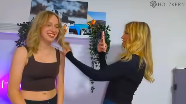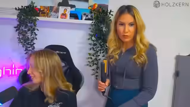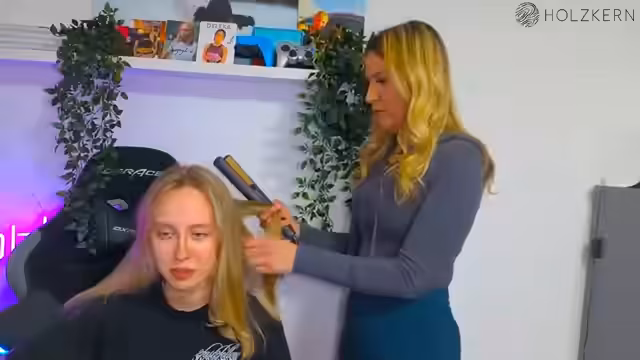 00:27:50Die Streamerin beginnt mit dem Haarstyling und bemerkt, dass Sophias Haare sehr oft elektrisch aufgeladen sind, was sie als nervig empfindet. Es wird nach einer Haarspange gesucht, um die Haare besser handhaben zu können. Die Streamerin versucht, leichte Wellen in Sophias Haare zu zaubern, da starke Locken zu lange dauern würden. Sie betont, dass sie keine Friseurin ist und handwerklich nicht sehr begabt ist. Es wird über den Geruch von deutschen Haaren in Kontakt mit Glätteisen diskutiert. Die Streamerin versucht, bestimmte Kurven in die Haare zu bekommen, ist sich aber nicht sicher, ob es klappt. Es wird humorvoll über die Kosten des Stylings gesprochen.