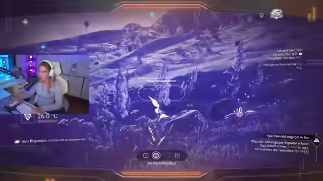 01:46:09Die Streamerin wechselt zu No Man's Sky und erklärt kurz das Spiel für diejenigen, die es nicht kennen. Sie zeigt ihren Planeten und ihr Alien-Aussehen. Sie hat vergessen, wie man das Raumschiff wechselt, findet es aber schließlich heraus. Sie fliegt zu einem unbekannten Planeten, um Ressourcen wie Kupfer zu sammeln, die sie zum Craften benötigt. Sie erklärt, dass sie Kabelbaum und chromatisches Metall benötigt. Sie fliegt zu einem Mond, obwohl sie eigentlich lieber einen anderen Planeten erkunden würde, da es dort meist mehr zu entdecken gibt. Sie landet auf dem Mond, obwohl dort schlechtes Wetter herrscht und sie Schaden nimmt. Sie scannt schnell ein paar Sachen, um Geld zu verdienen, und beschließt, den Planeten zu verlassen.