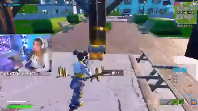 00:14:51Endlich beginnt die eigentliche Challenge in Fortnite. Die KI wählt ungewöhnliche Waffen: ein Sturmgewehr, eine Schrotflinte, eine Shotgun, Blue Life und einen Raketenwerfer. Die Streamerin muss versuchen, damit einen epischen Sieg zu holen, wobei sie sich über die sperrige Waffenauswahl beschwert. Sie kämpft mit der unbekannten Waffenkombination und versucht, die Challenge zu meistern, stößt aber auf mehrere technische und spielerische Hürden, wie fehlenden Loot oder ungünstige Spawn-Points.