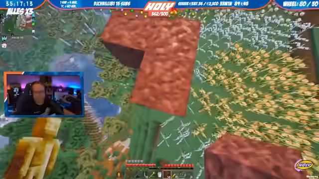 00:30:40Der Streamer beginnt mit dem Bau der Netherrack-Schicht und erkundigt sich bei Zuschauern nach alternativen Blumen, die verbrannte Erde imitieren könnten. Nebenbei klagt er über andauernde technische Probleme, insbesondere dass er den eigenen Stream nur sehr leise und dumpf wahrnimmt, was ihn stark ablenkt und frustriert. Er hält trotz seiner Krankheit am Stream fest, um sein Vorhaben umzusetzen.