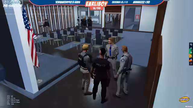 06:18:55Die Streife ist wieder auf den Straßen unterwegs. Es wird ein neues, sehr detailliertes Polizeirevor (PD) bewundert, das als das schönste Cop-MLO bezeichnet wird. Das Reviere hat eine große Eingangshalle und offene Büros. Es kommt zu einer Anfrage bezüglich eines Fluchtwagens, der ortet ist, doch der Fahrer ist nicht im Fahrzeug. Ein Beamter kollabiert aufgrund einer Erkältung und muss geheilt werden.