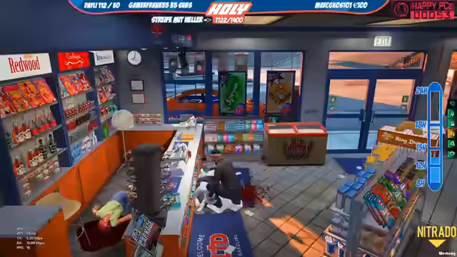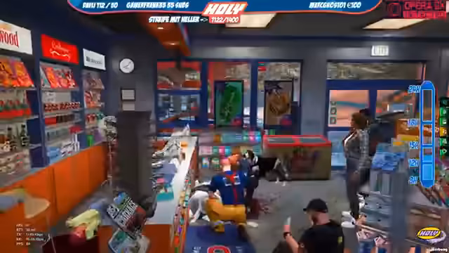 07:37:57Bei der Global Oil-Tankstelle kommt es zu einer Schießerei. Hans-Peter wird von der Kassiererin angeschossen, nachdem er sich über eine alte beschwert hat. Der Streamer handelt in Notwehr, alarmiert sofort den Notruf und kümmert sich um den Verletzten. Der Boden ist voller Blut, die Lage ist ernst. Hans-Peter ist ansprechbar, aber verletzt. Der Streamer stellt fest, dass es sich um einen Steckschuss handelt und versucht, die Blutung mit dem Daumen zu stopfen.