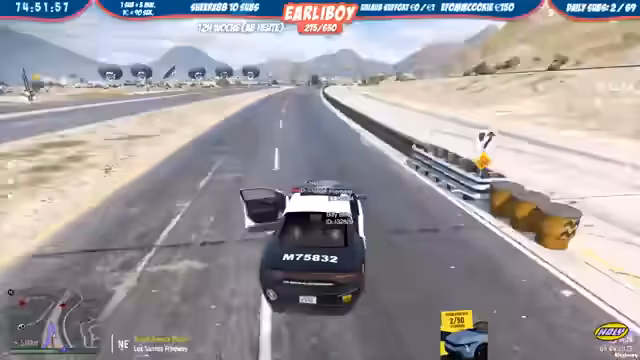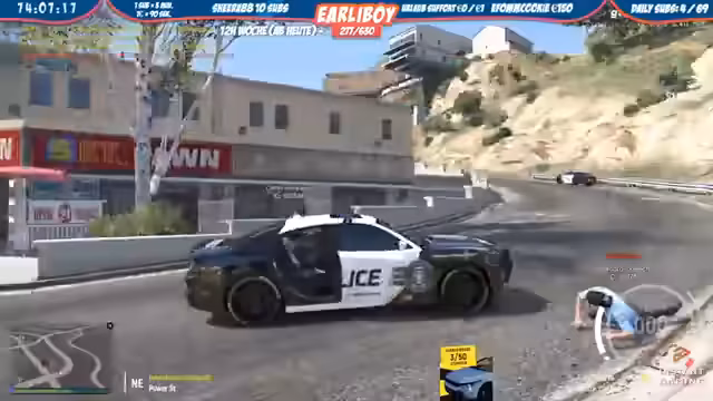 00:00:00Der Stream beginnt mit einem polizeilichen Einsatz, bei dem die Polizei einen Verdächtigen kontrolliert und ihn des Haftungsdiebstahls beschuldigt. Anschließend werden Nagelbänder auf dem Highway gelegt, um andere Verkehrsteilnehmer aufzufangen. Es kommt zu mehreren Unfällen, als Fahrer in die Fallen fahren. Die Polizei nutzt eine Drohne, um die Szene von oben zu beobachten, und weitere Beamte eintreffen, um die Verkehrskontrolle durchzuführen.
