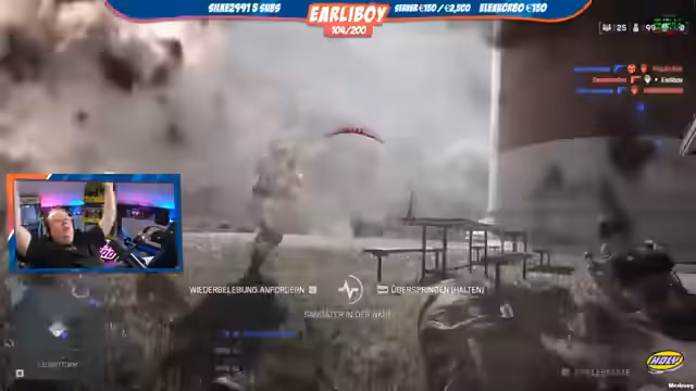 00:09:14Der Stream beginnt mit einer chaotischen Landung der Spieler, die versuchen, den Leuchtturm zu erreichen. Trotz eines missglückten Fallschirmsprungs und der anfänglichen Überzeugung, dass die Situation aussichtslos ist, gelingt es dem Team, die Gegner zu überraschen. Ein Spieler schießt von rechts auf die Gegner, die auf den Heli fixiert sind, was zu mehreren Kills führt. Die anfängliche Verwirrung und die unkonventionelle Taktik zahlen sich aus, auch wenn die Spieler selbst über die Effektivität ihrer Strategie überrascht sind. Die Gruppe muss jedoch schnell feststellen, dass weitere Gegner im Anmarsch sind und die Situation weiterhin angespannt bleibt.