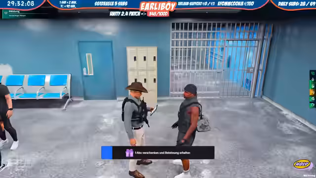 03:19:40Die Streamer sind in eine Polizeikontrolle geraten, die zu einer Festnahme führt. Ein Charakter wird inhaftiert und sitzt nun im Gefängnis, wo er Wäsche machen muss, um seine Haftzeit zu verkürzen. Im Stream wird über die Mechaniken des Gefängnissystems gesprochen, wie z.B. die Möglichkeit, durch bestimmte Tätigkeiten Zeit abzubauen. Gleichzeitig wird die Frage diskutiert, ob man im Gefängnis ein Telefon benutzen kann, um die Haftzeit zu manipulieren oder sich befreien zu lassen.