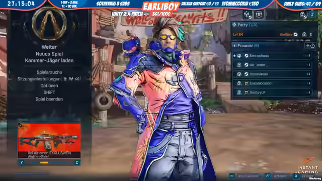 04:21:58Ein Streamer kauft sich eine Waffe und kündigt eine Spendenaktion für Coins an. Er erwähnt, dass er Coins bei einem Event gewonnen hat und noch welche übrig hat. Für bestimmte Kleidungsstücke, wie eine Weste oder ein T-Shirt, werden 150 Coins benötigt. Die Streamer rufen die Zuschufer auf, die Aktion mitzuverfolgen und zu unterstützen, um die benötigten Coins schnell zu erhalten und sich die Ausrüstung zu sichern.