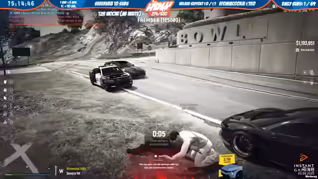 00:28:45Eine Verfolgungsjagd eines Kriminellen in Northside beginnt, die jedoch durch Serverprobleme unterbrochen wird. Der Server erleidet einen Timeout, was zum Abbruch der Verbindung führt. Es wird vermutet, dass das Problem durch fehlende Verbindung zum Masterlist verursacht wird. Nach dem Neustart des Spiels kommt es zu einer chaotischen Situation, in der ein Spieler getötet wird und die Ausrüstung verliert. Es wird überlegt, ob ein Krankenwagen gerufen werden soll, was jedoch aufgrund einer Wartezeit nicht möglich ist. Die Spieler diskutieren darüber, warum sie angegriffen wurden und vermuten ein zufälliges Ereignis. Es wird beschlossen, zum PD zurückzukehren, um neue Waffen zu besorgen. Währenddessen kommt es zu humorvollen Interaktionen mit anderen Spielern, die sexuelle Belästigungen unterstellen. Es wird über die Wahl der Waffen diskutiert, und es kommt zu einem Gespräch über ein Lotusblatt im Gesicht eines Spielers.