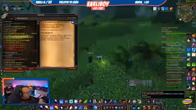 06:34:20Der Stream konzentriert sich auf den Fortschritt mehrerer Quests im Gebiet. Es wird über das Problem gesprochen, dass eine bestimmte Quest, 'Geheimnis im Dschungel', nicht angenommen werden kann, da es sich um ein Event handelt. Der Streamer prüft seine Questliste und stellt fest, dass ihm einige der benötigten Seiten für eine Sammelquest fehlen. Parallel dazu wird die Funktion von Quest-Items wie der 'Dschungelabstenei' erläutert, die im Gegensatz zu regulären Quest-Items überschüssig gesammelt und mit der Gruppe geteilt werden können, da sie keine Questmarkierung haben.