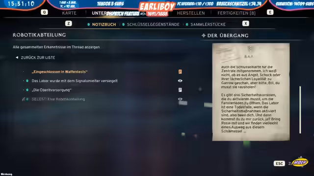 09:50:08Im Labor, das sich hinter mehreren Sicherheitskonsolen verbirgt, stößt der Streamer auf eine weitere Hürde: Er benötigt eine Atombatterie, um einen bestimmten Datenspeicher zu aktivieren. Es stellt sich die Frage, wie man in diesen Bereich gelangt und wie man die Sicherheitsmaßnahmen umgeht. Die Einrichtung des Labors wird als potenzielle Todesfalle beschrieben, wenn die Alarme ausgelöst sind, was eine strategische Herangehensweise erfordert.