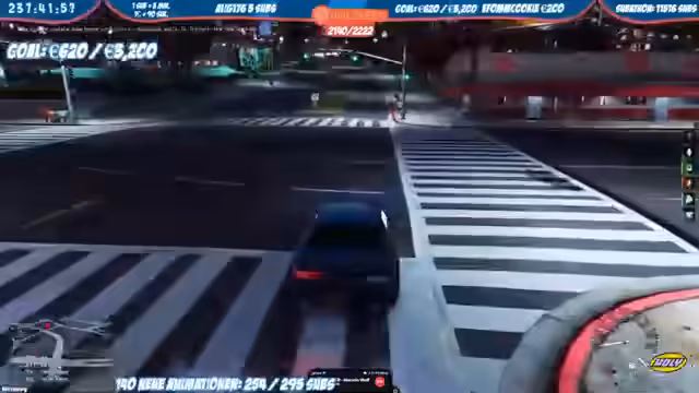 05:37:01Der Streamer fährt durch verschiedene Straßen des Spiels, darunter Port Lear Road, Battery Canyon Road und East Galileo Avenue. Er beschreibt seine Route, einschließlich Durchfahrt durch Tunnel und seine Fahrtrichtungen. Es kommt zu einigen unvorhergesehenen Situationen wie einem Verfolger und einem flüchtenden Fahrradfahrer.