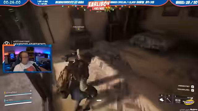 05:08:32Dieser Abschnitt zeigt den dynamischen Ablauf einer konkreten Spielrunde. Der Streamer beschreibt, wie er aus der Ferne die Aktivitäten von gegnerischen Teams beobachtet und überlegt, ob er sich ihnen vorsichtig nähern oder sich zurückziehen soll. Er trifft die Entscheidung, einen 'Yolo-Push' zu wagen, was zu einer heftigen Schießerei führt. Dabei werden mehrere Gegner ausgeschaltet, was ihm zwar viel Loot, aber auch eine erhebliche Menge Munition verschlingt. Die Situation ist hektisch, und es bleibt fraglich, ob er die Mission noch rechtzeitig abschließen kann.