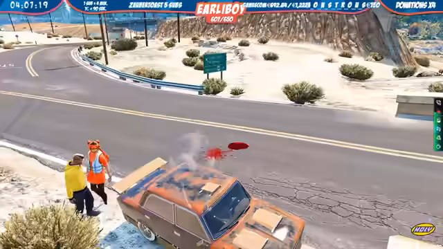 08:57:20Die Streamer verfolgen die verdächtigen Personen in der südlichen Gegend und können diese schließlich festnehmen. Die Festgenommenen werden in Handschellen genommen. Während der Verfolgungsjagd werden mehrere Personen beschuldigt, auf das Auto geschossen zu haben, und die Streamer diskutieren über die weiteren Schritte und die rechtliche Bewertung der Situation.