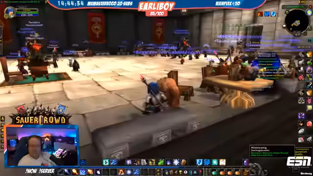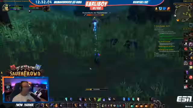 05:49:33Die Gruppe betritt den Dungeon 'Schattenfeste'. Der Streamer, als Holy Priest, übernimmt die Hauptheilerrolle und gibt Anweisungen zur Taktik, wie zum Beispiel Agro-Management und Heilmittelverwendung. Es werden Tipps für den Magier-Noisy gegeben, um seinen Schaden zu optimieren, und es wird über die Fähigkeiten der Gegner gesprochen. Während des Kampfes kommt es auch zu persönlichen Gesprchen, wobei der Streamer seine Erfahrung von 30.000 Spielstunden und einen World-First-Erfolg erwähnt.