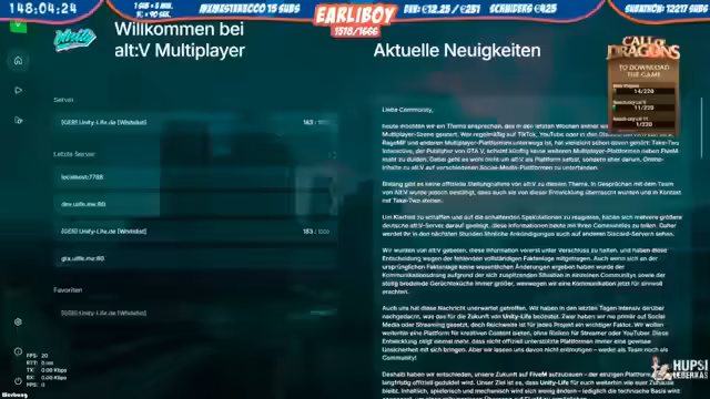 01:38:39Es werden Änderungen im Spiel besprochen, darunter Anpassungen der Crafting-Zeiten und die Reduzierung des Chlorbedarfs für Titan. Eine Liste mit Anpassungen für ein besseres Spielerlebnis wird erwähnt. Die überlangen Crafting-Zeiten, insbesondere für die Herstellung der M16, werden kritisiert. Es wird diskutiert, ob die Icons für Waffen und Items skaliert werden sollen, um sie auf größeren Bildschirmen besser erkennbar zu machen. Es wird das Problem kleiner Icons bei bestimmten Waffen wie der Uzi angesprochen. Es wird eine Ladenparty in Erwägung gezogen. Es wird das Rezept für Holzbretter gesucht und diskutiert, ob es sich um Crafting oder Farming handelt. Es wird erwähnt, dass das Rezept am Kohleofen ist, wo Holzbretter zu Kohle gemacht werden. Es wird über einen Traum von Hella gesprochen, die sich woanders beworben hat, möglicherweise auf einem anderen Server wie New Life oder Final. Es wird über die Anzahl der Spieler auf dem Server am Morgen diskutiert und die Möglichkeit, Crime-Sachen zu machen. Es wird über einen Kack-Server von früher gesprochen, bei dem es immer ein weirdes RP gab. Es wird über GVMP diskutiert und ob dieser noch groß ist. Es wird ein Light-RP-Server erwähnt und diskutiert, was das bedeutet. Es werden die Server Grand-RP und Majestics erwähnt, auf denen der Streamer gegen Bezahlung gespielt hat.