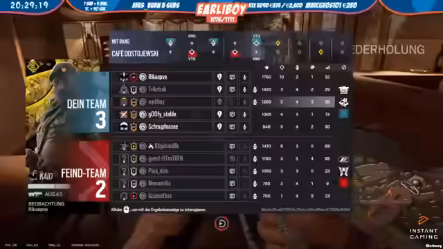 04:14:18Die Szene spielt sich hauptsächlich im virtuellen Raum des Spiels Rainbow Six Siege ab. Der Streamer gibt taktische Anweisungen an Mitspieler, wie z.B. die Zerstörung von Kameras und das Abcampen von Türen. Es kommt zu mehreren turbulenten Situationen, in denen Gegner bekämpft und Eindringlinge ausgeschaltet werden. Gleichzeitig interagiert der Streamer intensiv mit dem Chat, unterbricht das Gameplay für kurze Unterhaltungen und erwähnt persönliche Anekdoten, wie einen teuren Talisman in Valorant und die Anschaffung eines Fahrrads.