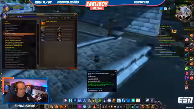 04:04:17Die Diskussion dreht sich um Waffen-Stats und Prioritäten: Ein Stab mit +31 Heilungszauber wird mit einem anderen Stab (+15 Intelligenz, +10 Willenskraft) verglichen. Es wird entschieden, dass Intelligenz und Willenskraft wichtiger sind als reiner Heilungsbonus, besonders für Quests. Der aktuelle Level-Stand wird überprüft (kurz vor Level 40), und es wird geplant, Berufe wie Alchemie und Kräuterkunde zu leveln, um Gold zu verdienen – da viele Spieler im Levelbereich 60–80 Gold haben, der Streamer aber nur 11. Zudem wird ein geplanter Dungeon-Run (Kathedrale) erwähnt.