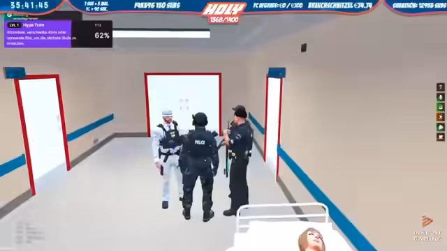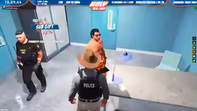 05:04:34Nach dem Höhepunkt des Hype Trains wird ein neuer Deal mit der Community ausgehandelt: Alles wird ab sofort um 'zwei' Stunden verlängert. Die Stimmung kehrt zum Gameplay zurück, das sich hauptsächlich im GTA RP abspielt. Ein Team der Staatsanwaltschaft und der Polizei führt eine Razzia im Gefängnis durch, um Waffenfunde zu sichern und die Haftordnung durchzusetzen. Der Streamer richtet sich auch ein neues 'Zuhause' ein und interagiert mit anderen Spielern im Rahmen des Rollenspiels.