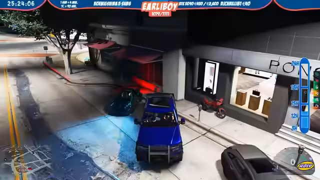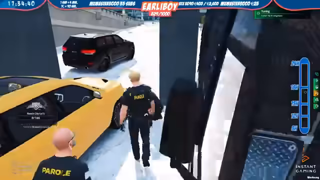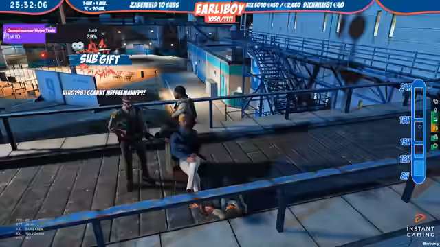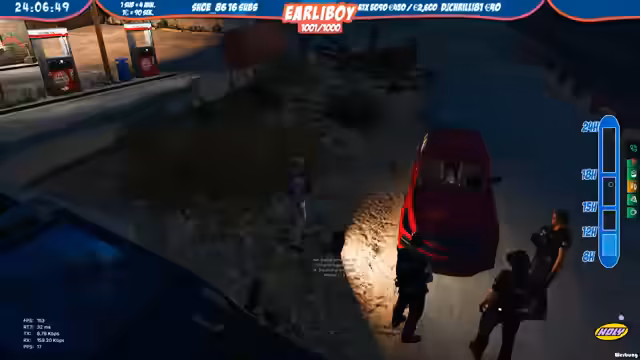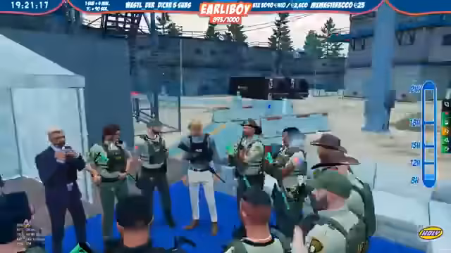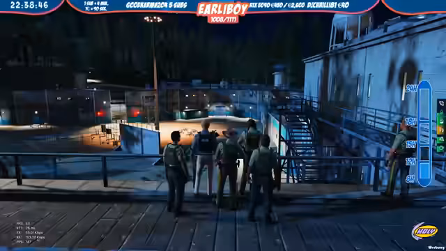 02:03:01Der Streamer führt als Polizei eine Verfolgungsjagd durch. Es gab eine Meldung über einen ausgebrochenen Militärstützpunkt. Die Einheit verfolgt mehrere Verdächtige, die in Richtung Cayden Tower flüchten. Es wurden zwei schwarze Jeeps zur Tarnung eingesetzt. Der Einsatz wird als 'Covert Operation' betrieben. Es gab auch Zwischenfälle wie Notrufmissbrauch. Die Polizei versuchte, die flüchtigen Personen zu stellen und dabei auch Reifen zu beschädigen.