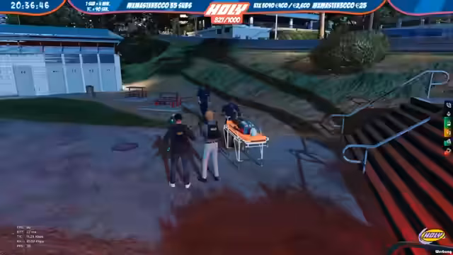 04:09:37Nachdem die Situation am Junkie Park vorläufig unter Kontrolle gebracht wurde, kehrt das Team zur Basis zurück. Dort wird ein Fahrzeug, ein Taugus, mit dem man bislang nicht vertraut war, genutzt. Der Streamer wechselt die Kleidung und berichtet von seiner Zufriedenheit mit dem Ausrüstungsstand der Polizei. Zeitgleich werden technische Probleme im Dispatch erwähnt und eine Diskussion über den Einsatz von Fahrzeugen wie dem Little Bird geführt.
