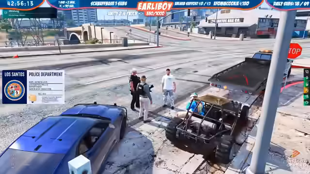 01:32:27Im Gespräch mit Klaus äußert sich der Beamte über einen Verdacht bezüglich einer Bestellung, bei der möglicherweise etwas fehlt. Es folgt ein kurzer Austausch mit Dalton vom SRDCR. Der Beamte mahnt Hans Mahol zur Funkdisziplin und überlegt, ob dies als Copsnitches zählt und welche Strafen dies nach sich ziehen könnte. Die Frage nach Einsätzen wird aufgeworfen, wobei festgestellt wird, dass um 17 Uhr wenig los ist und der Beamte sich über die Tagesbeschäftigung von Kollegen wundert, die eventuell an der Straße stehen. Eine Idee für ein Automatenbusiness wird diskutiert, jedoch bereits von anderen beansprucht. Es wird ein Kennzeichen erwähnt, dem nachgefahren werden könnte, und eine Beobachtung eines Fahrzeugs auf der Pokio in Richtung Nordenhof wird durchgegeben, inklusive der Information, dass es an der Sun Einfahrt vorbei und weiter Richtung Norden fährt. Der Beamte gibt Anweisungen, sich zu verpissen, da es Richtung Dackel und zur Assi-Kurve geht, wo man immer rausfällt. Ein Moppet liegt auf der Straße, und der Beamte fährt weiter Richtung Osten, die Kripsdauer lang Richtung Ellenweinburg.