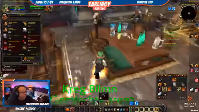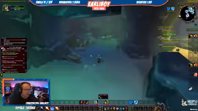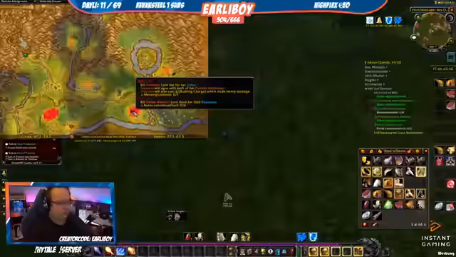 07:33:06Der Streamer questet in World of Warcraft, gelegentlich mit einem Eulen- und Papageien-Pet. Er kämpft gegen verschiedene Gegner, sammelt Questgegenstände wie Feuersteine und Krokodil-Schuppen und erledigt Missionen in Gebieten wie den Dunkelküsten und Brachland. Während des Streams treten immer wieder technische Probleme auf, die den Spielverlauf stören, wie zum Beispiel ein Ausfall von Twitch, das keine neuen Streams mehr öffnen lässt. Das Inventar wird schnell voll und die Suche nach bestimmten Questgegenst gestaltet sich als nervig.