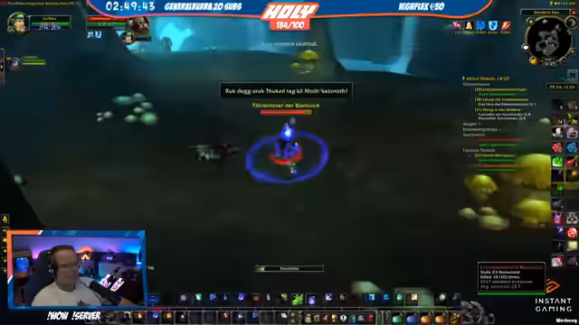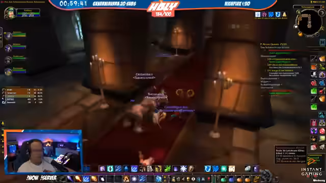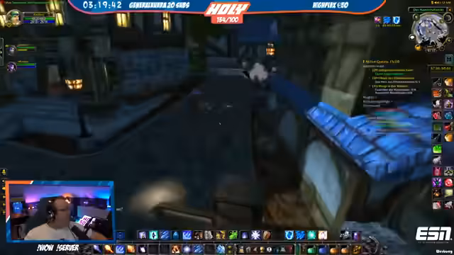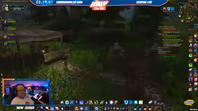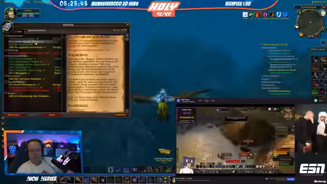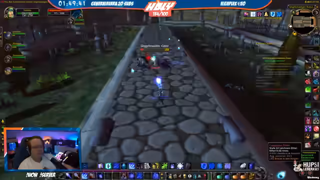 03:23:00Der Stream kehrt zum World-of-Warcraft-Gameplay zurück. Strobel diskutiert den Level-Fortschritt (29%) und geplante Instanz-Läufe mit Honor. Während des Grindens wechseln lockere Gespräche über Ausrüstung („geiler Hammer“) und Gameplay-Mechaniken. Einige Mitglieder diskutieren Badewannen-Humor und Water-Management, während die Gruppe neue Quests in höheren Level-Bereichen annimmt.