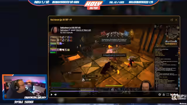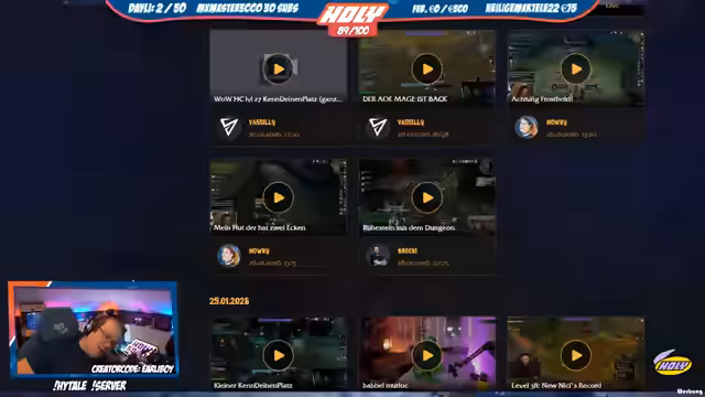 01:10:14Um sich und der Community eine Ablenkung von den persönlichen Problemen zu bieten, startet der Streamer eine spontane World of Warcraft-Session. Hierbei werden verschiedene Tode und Close Calls der Community angesehen, wie z. B. der Tod an 'Tof von Sauerkraut' oder ein 'Helt der Woche' im Leveling-Prozess. Er analysiert die Fehler der Spieler kritisch, wie z. B. das mangelnde Nutzen von Heil-Tränken, Safeguards oder das Ignorieren von Spiel-Mechaniken. Die Clips dienen als Unterhaltung und lehrreiche Beispiele für Fehltritte im Spiel.