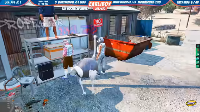 00:32:47Ein Chaos mit Fahrzeugen bricht los. Der Streamer zündet einen Baseballschläger an und versucht, mit Joffrey ein Auto anzuzünden. Das Fahrzeug gerät in Brand und wird zunehmend zerstört. Es kommt zu weiteren unkoordinierten Aktionen, wie dem Versuch, einen tonten Strauß, Joffrey, in ein Fahrzeug zu verfrachten. Der Streamer diskutiert über mögliche Gründe für die Verärgerung der Cops und fürchtet, dass die Aktionen negative Konsequenzen haben könnten.