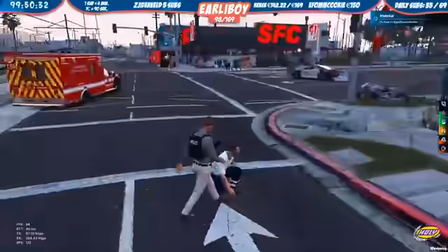 06:47:20Der Streamer wird als EMS-Einheit zu einem Einsatz gerufen, bei dem mehrere Verletzte an einer Schießerei behandelt werden müssen. Parallel dazu führt er als Polizeibeamter Kontrollen durch, unter anderem bei einem mutmaßlichen Hehlergeschäft mit einem Fernseher und der Jagd auf ein unregistriertes Fahrzeug. Dabei kommt es zu Spannungen und Vorwürfen gegenüber den Gefangenen.