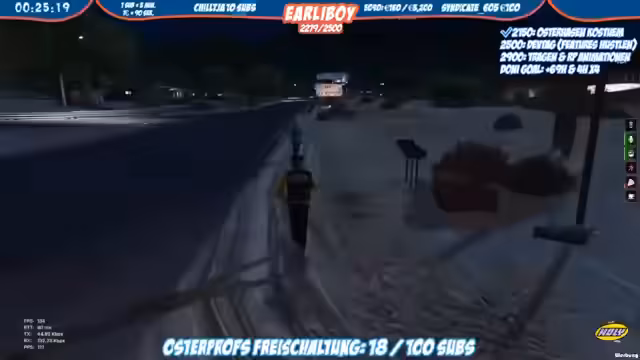 09:11:53Aktuell läuft ein Goal, bei dem durch das Erreichen von 100 Satz Osterprops freigeschaltet werden. Jeder auf dem Server kann dann sein Häuschen schmücken. Zusätzlich gibt es ein weiteres Ziel von 2500 Satz. Wenn das erreicht wird, wird es am Donnerstag einen kompletten Tag nur Dev-Kram geben. An diesem Tag sollen zusammen mit der Community Features wie Blinker und Warnblinkanlage durchgegangen werden, die sich auf der Liste befinden. Es wird überlegt, ob man dieses Jahr mit Joffrey Osterfeier verteilen könnte. Es werden viele Hasen in der Stadt platziert, die entweder am Poppen sind oder eine Karotte im Arsch stecken. Es wurden viele Osterprops gekauft, aus so vielen Shops. Wenn das Goal erreicht wird, können die Props platziert werden. Aktuell sind nur die Rezepte und das Crafting freigeschaltet, aber das Platzieren geht noch nicht.