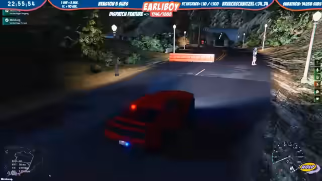 02:54:01Ein unvorhergesehener Wendepunkt im Stream ist ein simulierter Unfall, bei dem Kika und Ben mit einem Auto von einer Anhöhe stürzen. Der Streamer ruft einen Abschlepper und Rettungsdienst über die In-Game-EMS an und gibt exakte Koordinaten an der Mildenrot Road durch. Im Anschluss appelliert er an seine Community, dass es inakzeptabel sei, wenn Zuschauer bei laufenden Events in den Chats anderer Streamer schreiben und somit indirekte Werbung betreiben. Er betont, dies sei nicht produktiv und schade allen Beteiligten, solange der eigene Stream aktiv ist.