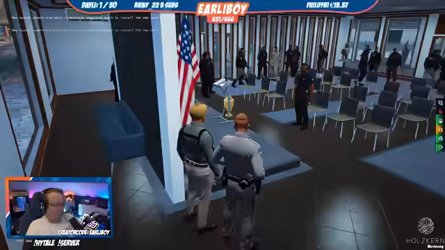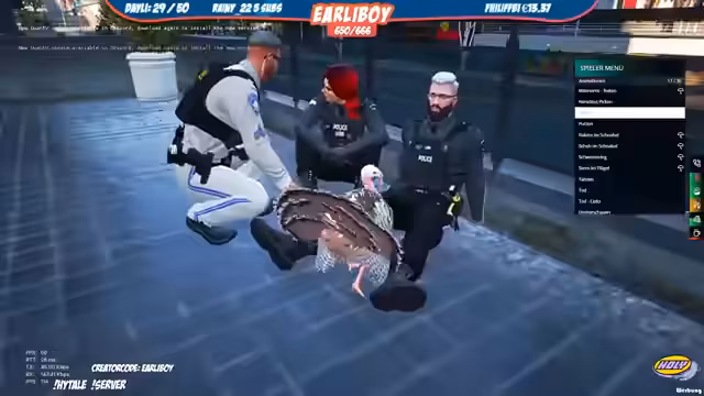 00:28:42Zu Beginn des Streams interagiert der Streamer im Rollenspiel mit Charakteren wie dem Tutan, Laia und Hatsch. Es geht um organisatorische Fragen der Streifenpatrouillen und unerwartete Begegnungen. Der Streamer witzelt über Truthähne in World of Warcraft und sammelt Handpässe, während er mit der sogenannten Trudern-Einheit interagiert. Der Fokus liegt auf der Etablierung der Rollen und der Aufnahme neuer Spieler in die laufende Simulation.