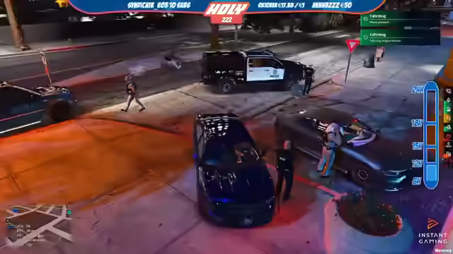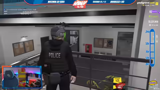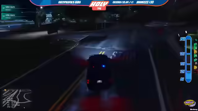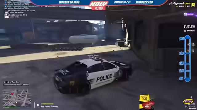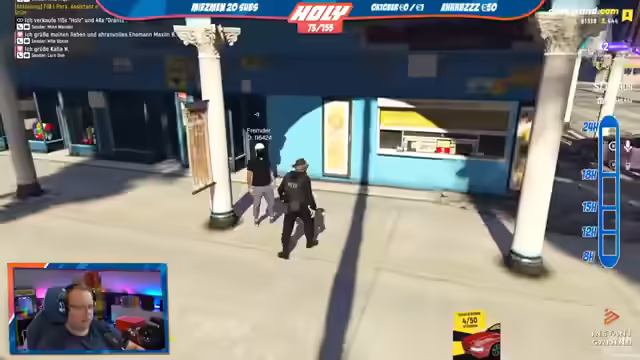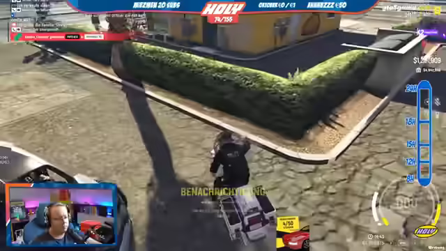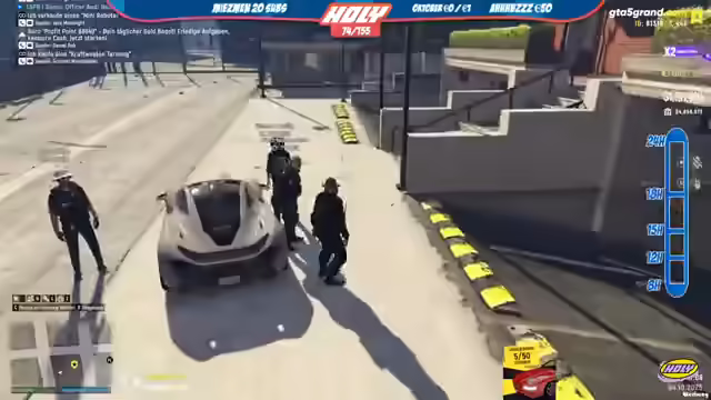 01:34:38Die Verfolgung der flüchtigen Täter gestaltet sich schwierig, da diese sich im EMS verstecken. Es wird eine Beschreibung der Täter gegeben, und die Suche wird fortgesetzt. Die Täter können jedoch entkommen. Der Streamer und sein Kollege kehren zum PD zurück, um ihre Arbeitsuniformen anzuziehen. Der Streamer erwähnt, dass er einen neuen Autoführerschein benötigt. Er tauscht seine Waffe gegen ein Sturmgewehr und kritisiert VDM (Vehicle Deathmatch). Es wird über die Vor- und Nachteile des LMGs diskutiert. Der Streamer und sein Kollege steigen in einen P1 und warten auf ein Dokument. Der Streamer distanziert sich von seinem Kollegen, der sich unangebracht verhält. Dem Kollegen werden Manieren beigebracht.