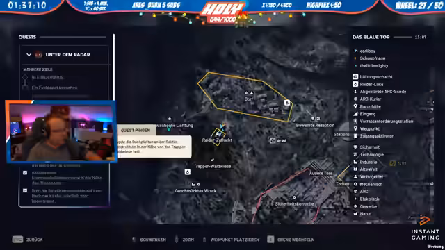 04:47:42Das Team diskutiert Quests im Zusammenhang mit dem Olivenheim und der Raider-Zuflucht. Es müssen Adrenalinspritzen mitgenommen werden, da sie lebensrettend sind. Der Fokus liegt auf der Aktivierung des Kommunikationszentrums im Olivenheim und Nageldachbrach. Die Map wird als zu offen für PvP kritisiert. Anschließend suchen sie nach Zellen und reparieren Dächer, wobei Navigation und Zielobjekte wie Felddepots Schwierigkeiten bereiten.