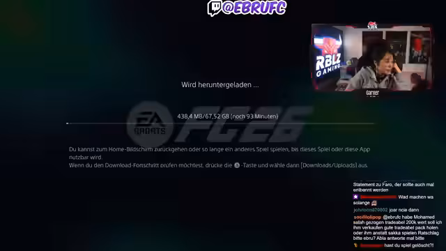 02:03:21Es gibt Schwierigkeiten beim Zugriff auf Ultimate Team, da das Limit für Konsolen erreicht wurde. Der Streamer fragt Ahmed, einen WL-Service-Zuhälter (im übertragenen Sinne), wie dieser das Problem löst. Ahmed schlägt vor, die PS4-Version des Spiels herunterzuladen. Es wird diskutiert, ob dies eine praktikable Lösung ist, da das Problem des Limits auch bei anderen Spielern auftreten müsste. Die Suche nach einer Lösung gestaltet sich schwierig und es wird überlegt, ob eine PS5 unten im Haus oder Offstream genutzt werden könnte, was aber als wenig sinnvoll erachtet wird. Die Downloadzeit der PS4-Version wird mit 73 Minuten angegeben, was die Geduld der Zuschauer auf die Probe stellt.