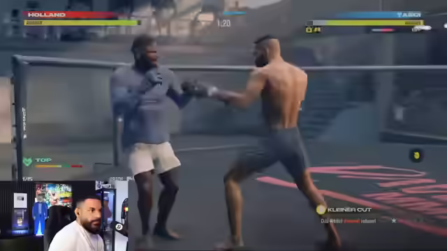 00:42:39Der Streamer startet seine UFC-Karriere im Spiel mit dem Ziel, die aktuelle Statistik von zwei Siegen und null Niederlagen beizubehalten. Er befindet sich in der Vorbereitung auf den nächsten Kampf gegen Raphael, wobei der Hype um den Kampf gering ist. Im Trainingslager werden neue Techniken einstudiert und Sparring absolviert, jedoch kommt es zu Verletzungen durch den Trainingspartner, was zu Unmut führt. Die Behandlung der Verletzungen wird als teuer und fragwürdig dargestellt. Es folgt ein Fokus auf die Verbesserung der Fitness und die Anpassung der Kameraposition im Stream. Der Streamer analysiert seinen Gegner, der ein Boxer ist, und passt seine Trainingsstrategie entsprechend an, indem er Kicks trainiert. Trotzdem kommt es weiterhin zu Verletzungen im Training, was den Streamer frustriert. Er hypet den bevorstehenden Kampf und verbessert seine Kämpferwerte, insbesondere die Kinnstärke und den Cut-Widerstand. Das letzte Sparring vor dem Kampf wird absolviert und die Zuschauer werden auf den bevorstehenden Kampf eingestimmt.