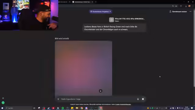 03:55:50Es kommt zu einer humorvollen und zugleich philosophischen Auseinandersetzung mit einer KI. Der Streamer möchte per Bildbearbeitung das gezeigte Auto in eine bestimmte Farbe lackieren lassen, was der KI jedoch mehrfach misslingt, was zu Frust führt. Das Gespräch wendet sich dann der Frage zu, ob eine KI eine Führungsposition anstreben würde. Die KI betont, sie sei ein Werkzeug ohne eigenen Willen und diene nur den Menschen, was der Streamer als deep und nachdenklich empfindet.