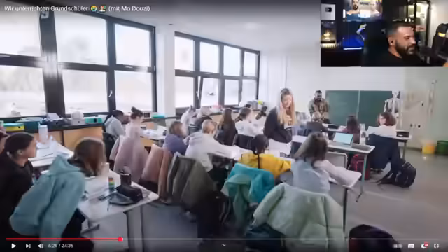 01:08:43Der Englischunterricht mit Marc Eggers beginnt mit einer Vorstellungsrunde auf Englisch, wobei der Streamer humorvoll auf Sprachschwierigkeiten und mögliche Reaktionen der Schüler eingeht. Es wird ein Lied mit dem Titel 'Du kennst meinen Namen, Moduzzi' geschrieben, wobei der Streamer die Schüler anleitet und korrigiert. Im Biologieunterricht werden Körperteile behandelt und ein Schüler für sein Wissen gelobt. Frau Kraft, die Praktikantin, wird vorgestellt und in den Unterricht einbezogen. Es folgt eine Diskussion über Berufswünsche und die Bedeutung von Bildung. Der Streamer schickt Frau Kraft für drei Minuten raus, da sie die Antwort vor gesagt hat. Der Unterricht wird spielerisch gestaltet, indem Wörter in höhere Stimmlagen gesungen werden. Am Ende des Unterrichts erhalten die Schüler eine Bewertung, wobei eine Schülerin besonders gelobt wird. Zum Abschluss wird das menschliche Skelett thematisiert und ein Witz über Sascha Hellinger gemacht. Die Kinder geben Feedback zum Unterricht von Professor Dr. Rehwi und Frau Graf gibt pädagogische Hinweise.