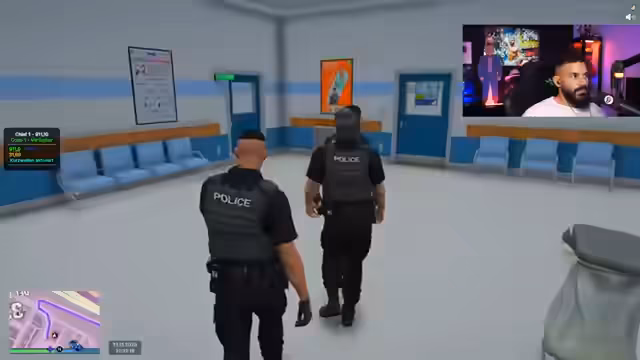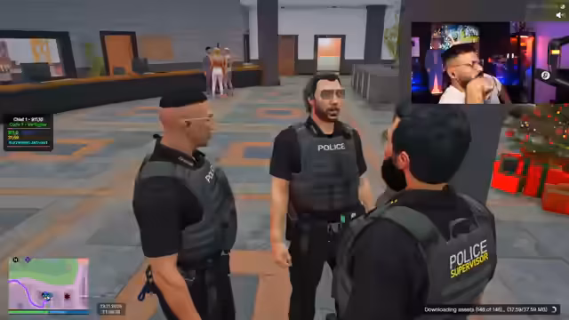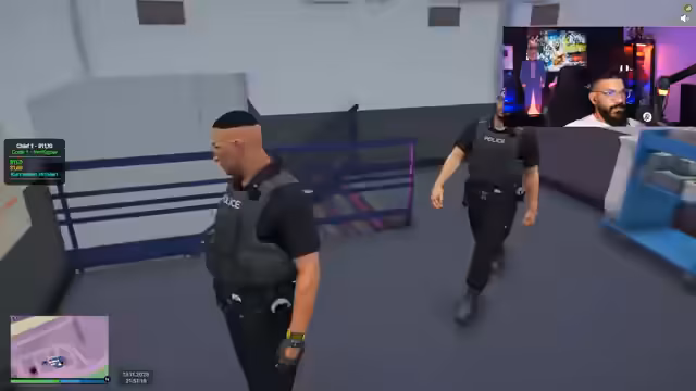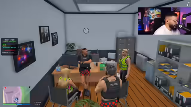 02:24:16Der Streamer wird von einem Kollegen, der sich als Mentor, Cousin und bester Freund vorstellt, angesprochen und gebeten, sich im PD zu treffen, um in Ruhe zu sprechen. Es stellt sich heraus, dass der Streamer bereits ein eigenes Büro im PD hat, was bei seinem Cousin für Überraschung sorgt, da dieser immer noch als Rookie gilt. Es wird eine Diskussion über die Arbeitsmoral und die Kriterien für ein eigenes Büro geführt. Später führt der Streamer seinen Cousin und andere Kollegen durch das PD, zeigt ihnen den Briefing Room und andere Bereiche, wobei er stolz die Einrichtung und die teuren Fliesen präsentiert. Es kommt zu einer humorvollen Auseinandersetzung über die Gestaltung der Wände und die Zugehörigkeit zu bestimmten Fußballvereinen.