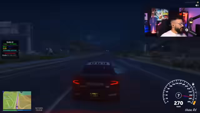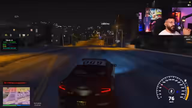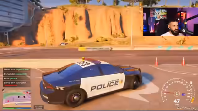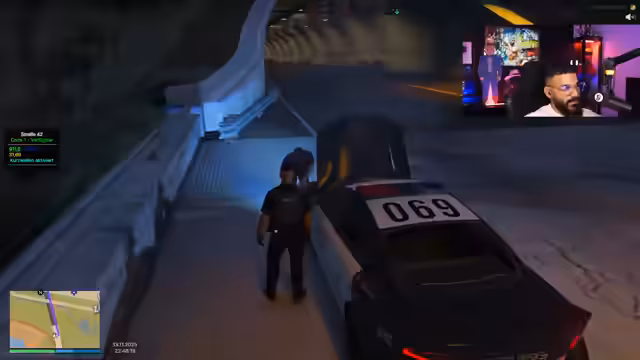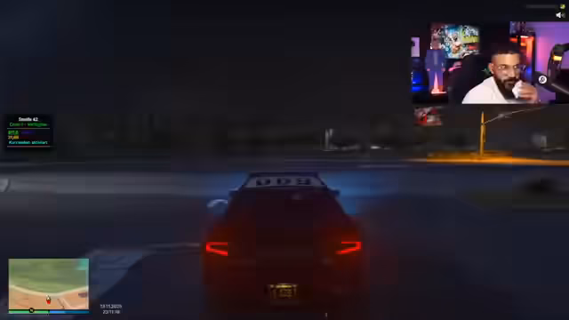 04:26:38Nachdem der Streamer und sein Team den ganzen Tag keinen einzigen 'TV' (vermutlich gestohlenes Fahrzeug) erwischt haben, schwören sie, nicht schlafen zu gehen, bevor sie einen fassen. Kurz darauf erhalten sie eine Meldung über ein gestohlenes CD-Fahrzeug, einen schwarzen Audi, der sich als Porsche entpuppt. Eine rasante Verfolgungsjagd beginnt, bei der der Streamer seinen Kollegen anweist, die Sirene des vordersten Fahrzeugs eingeschaltet zu lassen, um die Position des Flüchtigen zu kennzeichnen. Nach einer intensiven Verfolgung gelingt es dem Team, den Porsche zu stoppen und den Fahrer festzunehmen. Der Fahrer versucht, sich in einer Mischung aus Englisch und Deutsch zu verteidigen, wird jedoch wegen Bedrohung von Zivilisten, Flucht, Beleidigung und illegalen Waffenbesitzes konfrontiert. Bei der Durchsuchung des Fahrzeugs wird eine Pistole gefunden.