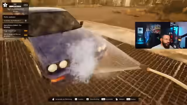01:29:15Nach dem Kauf eines Fahrzeugs mit sichtbaren Mängeln wie Rostflecken und einem defekten Auspuff beginnt der Streamer mit der Aufbereitung in seiner Werkstatt. Mit Hilfe verschiedener Werkzeuge wie Rostentferner, Spachtelmasse und Lack wird das Auto instand gesetzt. Dabei werden mehrere Arbeitsschritte gezeigt, darunter das Entfernen von Rost, das Auftragen von Spachtelmasse und das anschließende Lackieren, um das Fahrzeug wieder in verkaufsfähigem Zustand zu bringen.