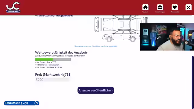 01:09:36Nach der Autowäsche wird das Auto geparkt und die Vorbereitungen für den Verkauf getroffen. Der Streamer zieht das Tablet heraus und macht Fotos von dem Auto, um sie online zu stellen. Es wird die realistische Darstellung des Autoverkaufsprozesses im Spiel gelobt, die über das einfache Kaufen und Verkaufen hinausgeht. Der Streamer begibt sich in sein Büro, das nicht gerade sauber aussieht, aber die Möglichkeit des Upgrades besteht. Es wird der Ablauf zur Erstellung einer Anzeige am PC beschrieben. Der technische Zustand des Autos wird begutachtet und der aktuelle Marktpreis ermittelt. Der Streamer überlegt, ob er den Preis über dem Marktwert ansetzen soll, um später herunterhandeln zu können. Es wird die Anzeige mit einem leicht erhöhten Preis veröffentlicht.