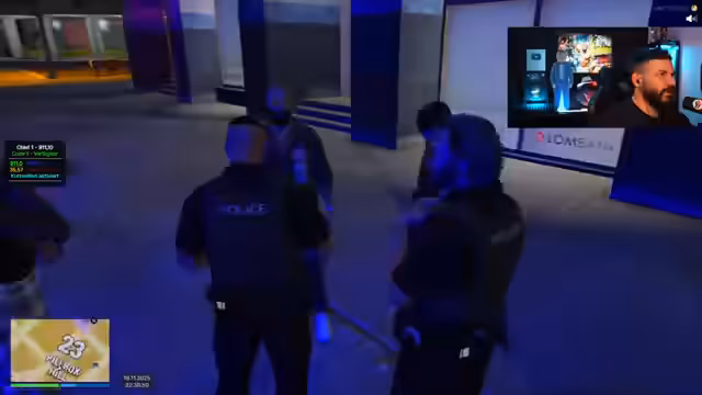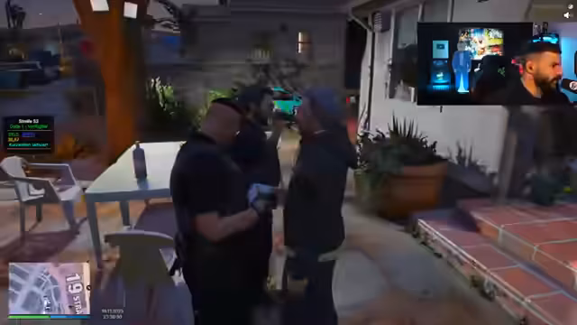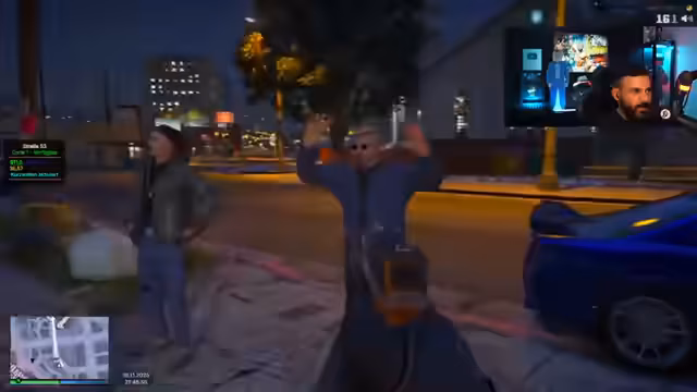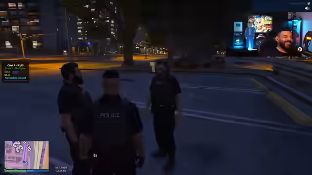01:02:53Die Szenerie beginnt mit einer angespannten Situation, in der der Streamer und ein Kamerad in eine Konfrontation verwickelt sind, die zu einer Verfolgungsjagd führt. Der Streamer berichtet, dass er und sein Begleiter von einer rivalisierenden Gruppe angegriffen wurden, die auch auf ihr Fahrzeug schoss. Bei einer anschließenden Kontrolle durch die Polizei wird ein Joint in seiner Hosentasche gefunden, der auf einen Konsum hindeutet. Er entschuldigt sich und behauptet, dies sei normal bei Kameradschaftsverhältnissen, aber die Polizei droht mit einer Festnahme.