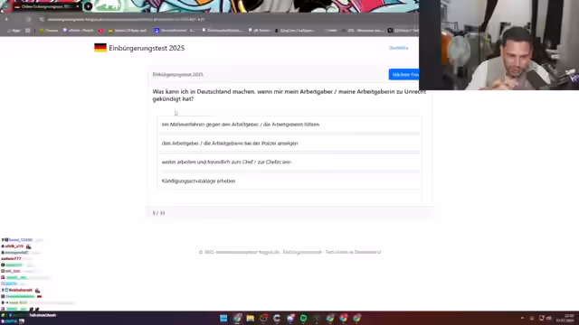04:17:33Nachdem der erste Streamer die Prüfung bestanden hat, ist nun Edis an der Reihe. Er muss ebenfalls 17 von 33 allgemeinen Deutschland-Fragen korrekt beantworten, um in Deutschland bleiben zu dürfen. Edis äußert sich zunächst sehr unsicher und betont, sich nicht mit Politik auszukennen. Die Fragen beginnen nun mit Themen wie dem freien Wahlrecht, dem Zweiten Weltkrieg und Maßnahmen der sozialen Sicherheit in Deutschland.