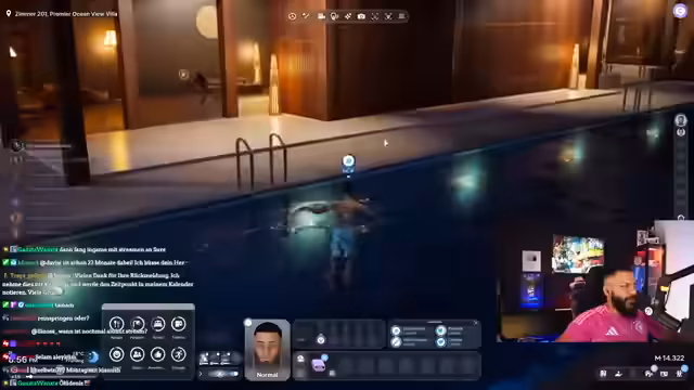 03:07:25Es wird über die Pool-Challenge gesprochen, bei der man in alle Schwimmbecken der Resort-Insel springen muss, um Punkte zu erhalten. Ein Problem besteht darin, dass der Charakter nicht in alle Pools gelangen kann. Es wird auch die Date Night-Challenge thematisiert, bei der der Streamer Schwierigkeiten hat, ein Date zu bekommen, da sein Charakter verheiratet ist und dies in der Stadt bekannt ist. Andere Spieler bieten an, die Date Night-Challenge zu übernehmen, da sie einfach zu sein scheint – es geht darum, einen Charakter anzusprechen, zu flirten und ein Date für den Abend zu planen. Des Weiteren wird diskutiert, ob es reicht, bei der Veranstaltung Date Night reinzuschreiben, wobei klargestellt wird, dass ein Soi angesprochen und nach einem Date gefragt werden muss, was aber aufgrund des Beziehungsstatus schwierig ist.