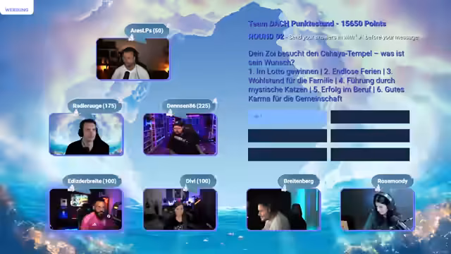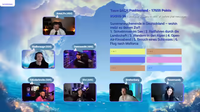 05:38:44Das Quiz beginnt mit der Frage, wohin man in der ersten Nacht in Schahaya geht. Die Zuschauer spammen ihre Antworten in den Chat, und der Streamer muss erraten, welche Antwort am häufigsten gewählt wurde. Radlerauge errät die richtige Antwort und erhält 150 Punkte. Es wird erklärt, dass der Streamer erraten muss, welche Antwort am meisten in den Chat gespammt wurde. Edis wählt Picknick am Strand beim Sonnenuntergang und erhält 100 Punkte. Die nächste Frage ist, was der Wunsch beim Besuch des Chaya-Tempels ist. Die Chats schreiben ihre Wünsche in den Chat, und der Streamer muss die häufigste Antwort erraten. Es wird überlegt, das System auszutricksen, indem man etwas wählt, womit niemand rechnet. Densen errät den Lotto-Gewinn und erhält 150 Punkte. Die nächste Frage betrifft die Prioritäten beim Hausbau. Die Chats stimmen ab, und der Streamer muss die häufigste Antwort erraten. Es wird betont, dass ein Hashtag vor der Nummer wichtig ist, damit das System die Antwort zählt. Die nächste Frage ist, welche deutsche Stadt die beste Inspiration für eine neue Karte wäre. Die Community ist uneins, was die Auswahl erschwert. Die letzte Frage ist, wo es den Zeu an einem Sommerwochenende hinzieht. Es wird überlegt, welche Antwort am wahrscheinlichsten ist, wobei verschiedene Optionen in Betracht gezogen werden.